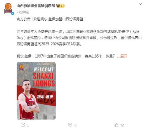 本赛季山西男篮表现较之上赛季存在下滑,他们急需引援升级阵容实力。如今山西官方宣布:经与球员本人协商并达成一致,山西男篮与球员凯尔-盖伊正式签约,待向CBA公司报送注册材料并审核、公示通过后,盖伊将代表山西男篮征战2025-2026赛季CBA联赛。