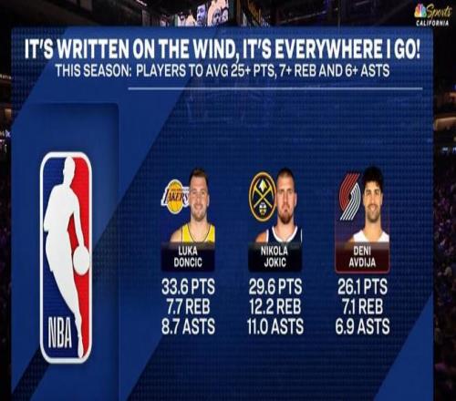 需要关注的是,东契奇在此役还创下了纪录。转播方数据显示,本季联盟仅3人场均超25分7板6助:东契奇、约基奇、阿夫迪亚。