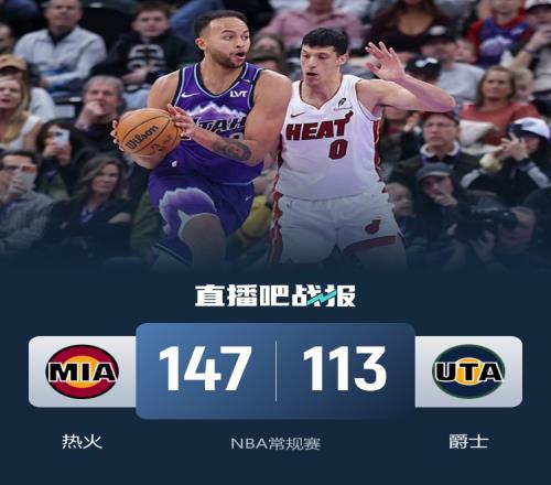 比赛开始,爵士率先发力打出11-4开局,维金斯和阿德巴约、亚库乔尼斯接连3记三分止血反超,但爵士全民皆兵咬住,首节热火仅领先1分,次节爵士进攻端突然断电,打了7分多钟还未上双,热火多点开花领先到双位数,随后热火继续发力第二节单节净胜20分。下半场,双方大战对攻大战,努尔基奇再次策应,森萨博接连三分追分,但热火多点开花始终能回应,末节双方继续围绕着20分左右领先拉锯战,热火继续扩大到近30分领先,最终热火147-116大胜爵士。