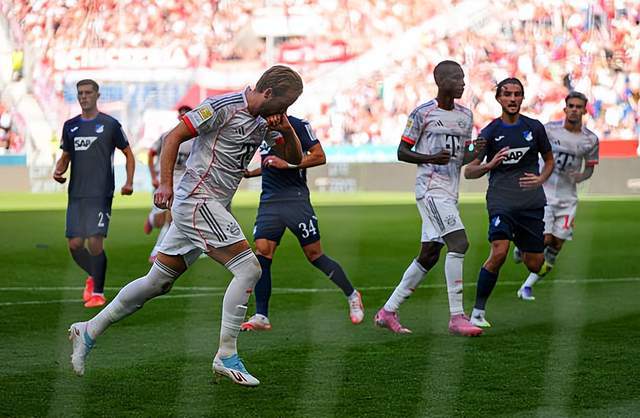 第44分钟,一直处于被动的拜仁打破僵局:小将卡尔主罚角球,低平球送到门前,凯恩包抄抽射破门,1-0!凯恩本赛季各项赛事出场7次已经斩获11球,冠绝整个五大联赛。易边再战,拜仁迅速扩大优势。第47分钟,博埃右路传中,打在霍芬海姆后卫的手臂上,裁判果断判罚点球,凯恩操刀命中,完成梅开二度好戏,2-0!