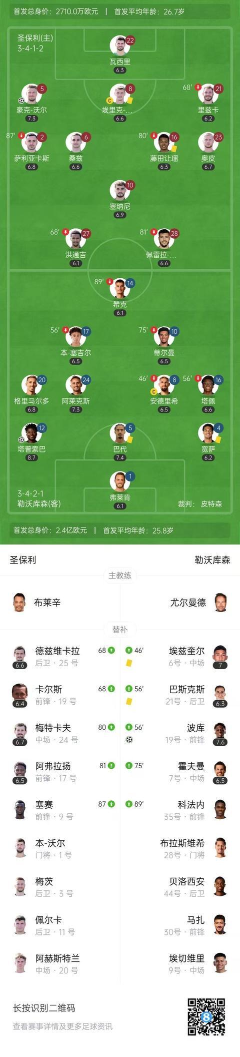 全场比赛结束,圣保利1-2勒沃库森。【双方首发及替补阵容】
