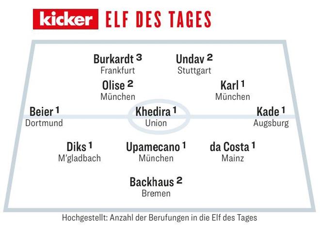守门员:巴克豪斯(不莱梅)后卫:迪克斯(门兴)、于帕梅卡诺(拜仁)、丹尼-达科斯塔(美因茨)中场:拜尔(多特)、拉尼-赫迪拉(柏林联合)、安东-卡德(奥格斯堡)、奥利塞(拜仁)、伦纳特-卡尔(拜仁)前锋:伯卡特(法兰克福)、昂达夫(斯图加特)