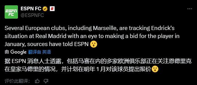 今年夏天,法甲豪门马赛曾差点从皇家马德里租借到塞瓦略斯。如今,这家法国豪门又盯上了皇马的另一位球员——19岁的巴西前锋恩德里克。他伤愈归队已一个月有余,虽然五次进入皇马比赛大名单,但至今没有得到1次出场机会。在阿隆索手下,恩德里克前途未卜。 本赛季至今,恩德里克与替补门将卢宁、本周才恢复健康的左后卫门迪一样,尚未获得过出场时间。9月20日对阵西班牙人的比赛,他首次回到替补席,随后对阵莱万特、马竞、阿拉木图凯拉特、比利亚雷亚尔的四场比赛也继续枯坐冷板凳。 据ESPN报道,马赛已就恩德里克一月租借的可能性向皇马进行了初步询问,且这并非皇马收到的唯一一份问价。皇马预计在冬窗前还会有更多类似的接触。事实上,今年夏天皇马就曾建议恩德里克外租寻找机会,但球员本人坚持留下,争取在阿隆索麾下获得机会。 上赛季,恩德里克曾在安切洛蒂手下得到过37次出场机会,其中8次首发,贡献了7粒进球。报道指出,恩德里克及其经纪团队认为“现在还不是做决定的时候”,一切要等“更晚阶段”再评估。很显然,恩德里克是在待价而沽。即便是外租练级,他希望能找一个自己喜欢的新下家。 明年1月份冬窗开启之前,恩德里克还有两个多月的时间来征服阿隆索。而在目前的皇马阵中,恩德里克是9号位上的第3选择。在姆巴佩轮休时,曾在世俱杯上崭露头角的冈萨洛·加西亚已经抢得出场先机。目前来看,恩德里克与加西亚很难同时获得足够时间继续成长,皇马必须在冬窗前给出答案。