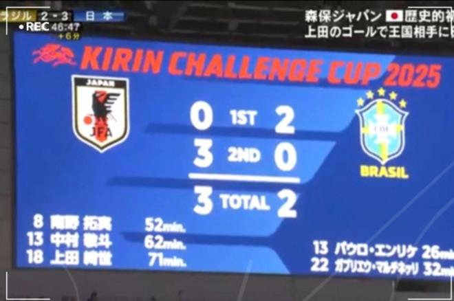 北京时间10月14日晚,日本队创造历史,他们在主场3-2击败了五星巴西,这是日本队队史上首次战胜巴西。此外,森保一也连续击败了3位欧冠冠军的世界级名帅。在自己的主场,日本队打得非常有血性。尽管控球率不如对手,但日本队从开场第一分钟开始就一直在全力进攻。上半场,日本队连丢2球。下半场,日本队奋起反击,连入3球。当比赛才进行到71分钟的时候,日本队就3-2反超了。此时,日本官方电视台提前宣布比赛结束,打出了“日本队首次战胜五星巴西”的字幕。最终,日本队没有让他们的电视台被打脸,守住了3-2的胜果。比赛结束后,日本队全体球员冲进球场,见证这一历史性的时刻。看台上,数万名日本球迷也是集体鼓掌、呐喊、挥舞旗帜,庆祝球队创造了辉煌的一刻。日本队与巴西队此前交手13次,日本队战绩为11负2平,完全被碾压。从1989年7月首次交锋到现在,整整36年过去了。日本队此前从未赢过巴西。不过,蝴蝶在今日终于飞过了沧海,日本队终于掀翻了赢得世界杯次数最多的巴西队。另外,日本队也是本世纪首支击败巴西队的日本球队。而对日本主帅森保一来说,这场比赛也有着特殊的意义。执教日本队以来,他已经击败了恩里克、弗里克以及安切洛蒂这三位曾夺得欧冠冠军的世界名帅。2022年世界杯上,日本队先后击败了德国队和西班牙队。2023年9月,日本队4-1血洗德国队,随后弗里克被解雇。今日,安切洛蒂又遭遇巨大羞辱。赛后,安帅气得直接离场,没有说一句话。森保一曾多次豪言要带领日本队冲击世界杯冠军。为此,他曾屡遭外界嘲讽。但是,森保一向世人证明他说那些话真不是吹牛的。