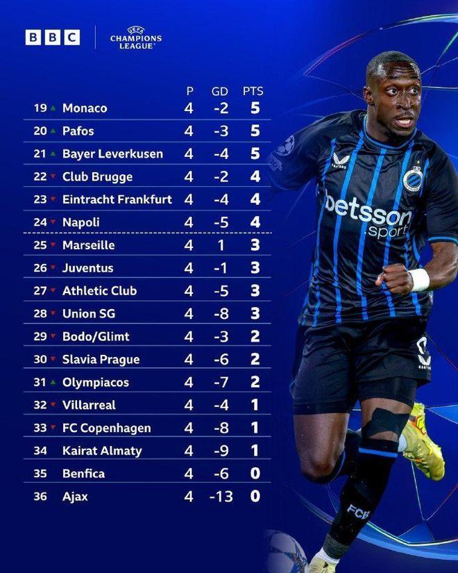 本轮爆冷未赢的豪门则有巴萨和切尔西,两队都在客场翻车。巴萨3-3战平布鲁日,而切尔西则在轮换阵容情况下2-2战平卡拉巴赫。两队分别跌至积分榜第11位和第12位。