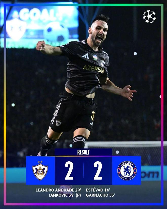 马雷斯卡大轮换阵容在客场翻车,上半场拉维亚开场不久就伤退,埃斯特旺16分钟进球领先,29分钟哈托失误,安德拉德扳平。39分钟哈托禁区内手球送点,扬科维奇点射,切尔西半场1-2落后。下半场7分钟加纳乔传球被挡后左脚推射扳平,最终,首发身价仅1232万欧的卡拉巴赫2-2逼平4.2亿欧的切尔西。这是卡拉巴赫欧战7次面对英超球队拿到的第一分。