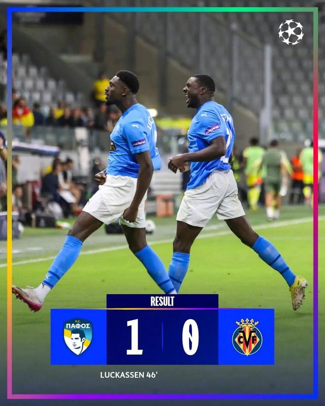 欧冠今夜见证历史,塞浦路斯球队帕福斯主场1-0战胜比利亚雷亚尔,欧冠新军取得了队史正赛首胜。黄潜在技术统计上占据绝对优势,但18脚射门、5次射正都没能转化为进球,反倒被帕福斯利用角球,在第46分钟由卢卡森头球一锤定音。本菲卡0-1勒沃库森