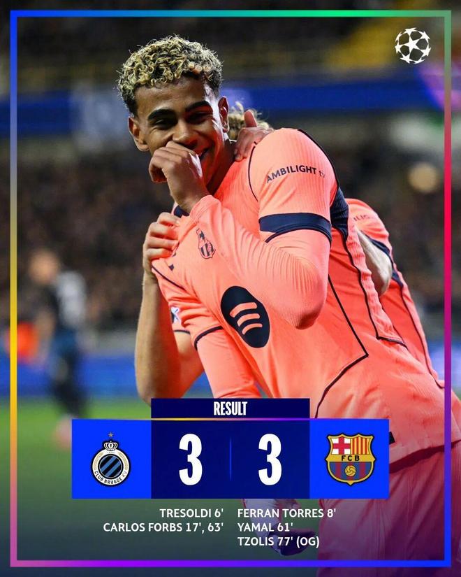 巴萨三度落后三度追平,上半场特雷索尔迪率先进球,费兰-托雷斯迅速扳平,博尔赫斯破门主队半场2-1领先。下半场费尔明助攻亚马尔扳平,博尔赫斯梅开二度,亚马尔造佐利斯乌龙,两队3-3握手言和。亚马尔的欧冠生涯已经贡献7球6助攻,成为继姆巴佩之后,第二位在19岁前欧冠直接参与13球的球员。Squawka统计,亚马尔本赛季各项赛事10次登场5球5助攻,总计参与10球,场均参与1球。卡拉巴赫2-2切尔西