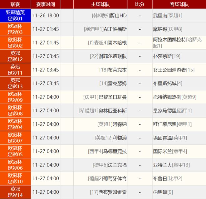 欧冠 曼彻斯特城 0-2 勒沃库森 北京时间11月26日04:00,欧冠联赛阶段第5轮,曼城坐镇伊蒂哈德球场迎战勒沃库森。上半场,格里马尔多首开纪录。曼城半场0-1落后勒沃库森。下半场,希克扩大领先优势,替补登场的哈兰德错失破门良机。最终曼城0-2不敌勒沃库森,遭遇本赛季欧冠首败。欧冠 切尔西 3-0 巴塞罗那 北京时间11月26日04:00,欧冠联赛阶段第5轮,切尔西坐镇斯坦福桥球场迎战巴塞罗那。上半场恩佐两进球被吹,费兰和内托各自错失单刀球机会,孔德自摆乌龙,阿劳霍两黄变一红,切尔西暂1-0巴塞罗那;下半场桑托斯进球因加纳乔越位在先无效,埃斯特旺一条龙破门,恩佐助攻德拉普锁定胜局,最终切尔西3-0巴塞罗那,各项赛事三连胜。欧冠 多特蒙德 4-0 比利亚雷亚尔 北京时间11月26日04:00,欧冠联赛阶段第5轮,多特蒙德主场迎战比利亚雷亚尔。上半场布坎南破门无效,安塞尔米诺助攻吉拉西头球首开记录,下半场阿德耶米两度造点,福伊特直红被罚下,吉拉西点射扩大比分,阿德耶米建功,法比奥席尔瓦失点,斯文松补时破门,最终多特4-0十人比利亚雷亚尔近四场比赛首胜。欧冠 那不勒斯 2-0 卡拉巴克 北京时间11月26日04:00,欧冠联赛阶段第5轮,那不勒斯坐镇主场迎战卡拉巴赫。上半场,内雷斯精彩倒钩被扑。易边再战,霍伊伦失点,麦克托米奈破门+造乌龙。最终那不勒斯2-0卡拉巴赫。欧冠 阿贾克斯 0-2 本菲卡 北京时间11月26日01:45,欧冠联赛阶段第5轮,本菲卡客场挑战阿贾克斯。上半场达尔6分钟闪击,下半场克拉森失良机,巴列罗90分钟锁定胜局。最终本菲卡客场2-0战胜阿贾克斯,本菲卡取得本赛季欧冠首胜+终结4连败,阿贾克斯遭遇欧冠5连败。其他赛事比分:欧冠 马赛 2-1 纽卡斯尔联欧冠 加拉塔萨雷 0-1 吉罗斯欧冠 博德闪耀 2-3 尤文图斯欧冠 布拉格斯拉维亚 0-0 毕尔巴鄂竞技亚冠精英 墨尔本城 2-0 柔佛亚冠精英 江原FC 1-3 町田泽维亚亚冠精英 上海海港 1-3 FC首尔亚冠精英 成都蓉城 1-1 广岛三箭亚冠精英 阿布扎比联合 3-1 萨德亚冠精英 利雅得新月 4-0 巴格达警察 赛事前瞻敬请留意