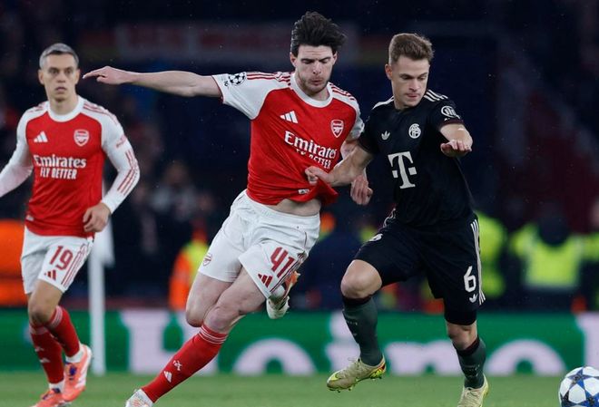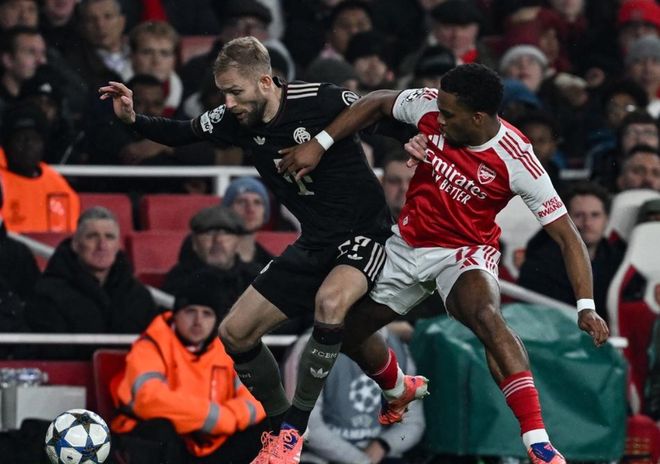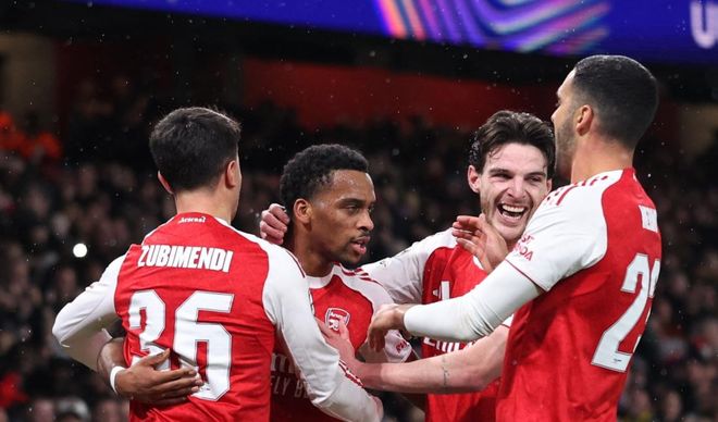 欧冠联赛阶段第5轮小组赛展开争夺,阿森纳在主场迎战拜仁。阿森纳在联赛战绩出色,12场联赛9胜2平1负,拿到29分,排名榜首,领先身后的切尔西6分,争冠形势一片大好。而在欧冠赛场,阿森纳的成绩也极其出色,前4场小组赛全都获胜。这次阿森纳面对的是同样前4场小组赛全胜的拜仁。结果,阿森纳笑到最后,拿下比赛,欧冠5连胜,阿尔特塔真是神了!阿森纳排出433阵型。萨卡、梅里诺和特罗萨德的进攻三叉戟联袂出击。埃泽、马丁-苏比门迪和赖斯组成3中场。廷贝尔、萨利巴、罗梅罗和刘易斯-斯凯利4后卫首发出战。戴维-拉亚担任首发门将。马丁内利、马杜埃凯和厄德高坐在替补席待命。哲凯赖什和加布里埃尔因伤缺阵。比赛刚开始不久,阿森纳利用定位球机会制造威胁,萨利巴头球攻门,顶高了。4分钟后,特罗萨德突入禁区左侧,单刀挑射,踢偏了。第18分钟,奥利塞在右侧强行突破下底传中,被挡了出去。4分钟后,阿森纳进球了!萨卡开出角球,廷贝尔高高跃起,头球一顶,球进了。第30分钟,埃泽在禁区左侧低射远角,踢偏了。2分钟后,拜仁扳平比分!格纳布里在禁区右侧接到长传球,直接把球垫到中路,卡尔后插上直接射门,球进了!这是本赛季阿森纳在欧冠赛场首次丢球。第36分钟,斯塔尼希奇突入禁区右侧,起脚低射远角,踢偏了。第43分钟,莱默尔犯规拿到黄牌。半场结束,双方踢成1-1平手。下半场易边再战。第48分钟,萨卡在禁区右侧拔脚怒射,诺伊尔化解险情。7分钟后,梅里诺头球攻门,顶得有点正,门将把球没收。随后,卡尔的射门力量不足,门将迅速落地把球扑住。第62分钟,赖斯突入禁区的射门被门将挡出。第69分钟,阿森纳再度领先。卡拉菲奥里在左侧送出传中球,马杜埃凯包抄射门打进。第77分钟,诺伊尔出击失误,马丁内利过人后推射空门得手。第81分钟,拜仁派上了格雷茨卡和格雷罗,但这些换人也没有用。最终,阿森纳3-1击败拜仁。
