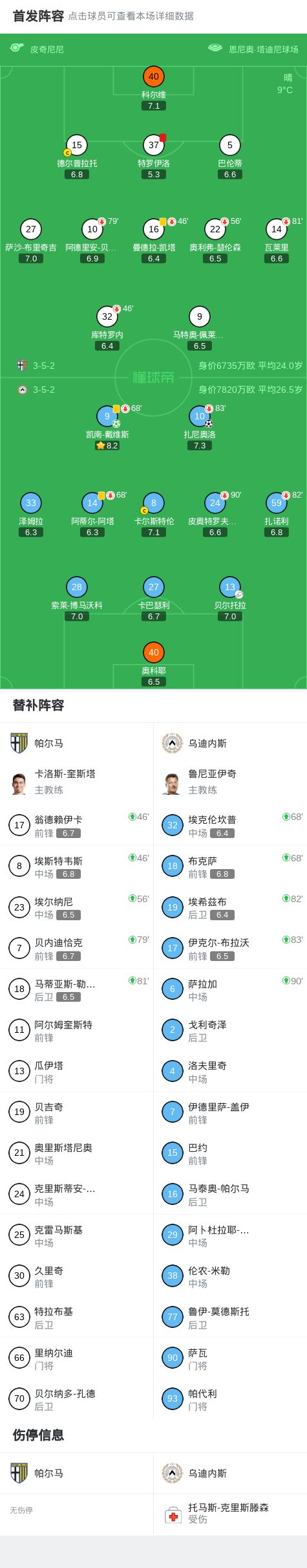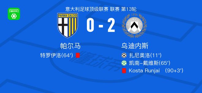 乌迪内斯20帕尔马,扎尼奥洛建功,凯南戴维斯锁定胜局
