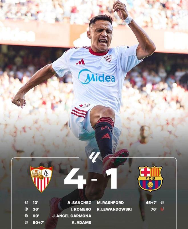 爆冷!彻底的爆冷!北京时间10月5日凌晨,西甲第8轮上演焦点之战,巴萨客场挑战塞维利亚,赛前弗里克的球队是联赛唯一保持不败的球队,纵观两支球队至今的表现,外界还是认为红蓝军团全取3分问题不大,可谁想到却被主队在皮斯胡安球场被打得体无完肤,莱万罚丢点球,拉什福德虽然打进加盟后的首球,却难挽败局。最终,巴萨客场1比4惨败,吞下联赛首败,也让皇马笑纳榜首之位!