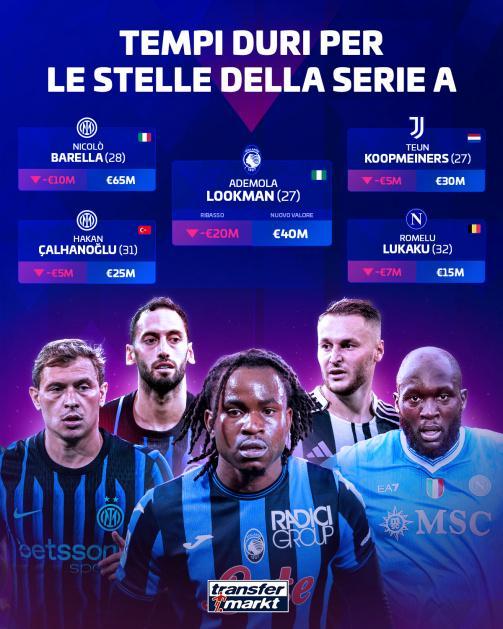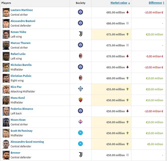 伊尔迪兹以2500万欧涨幅成为此次身价涨幅最高的意甲球员,尼科·帕斯以2000万欧位列次席。而在身价下跌方面,今夏闹转会失败的亚特兰大前锋卢克曼下跌至4000万欧,跌幅为2000万欧,成为跌幅最大的意甲球员。