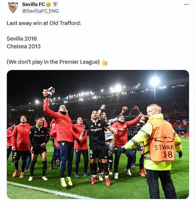 “老特拉福德最近一次客队胜利:塞维利亚2018年,切尔西2013年。”塞维利亚写道,“我们可不在