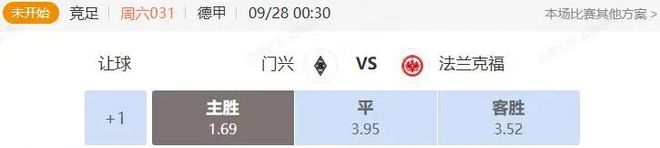 2.专家:彭天顺竞足 周六031 德甲 门兴VS法兰克福开赛时间:2025-09-28 00:30:00