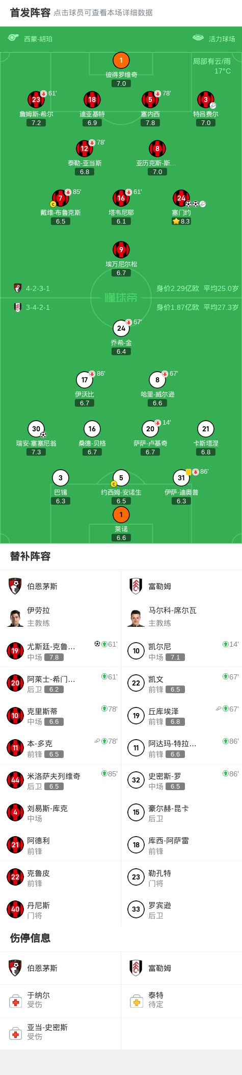 英超第70分钟,丘库埃泽直塞,塞塞尼翁捅射破门,富勒姆1-0伯恩茅斯