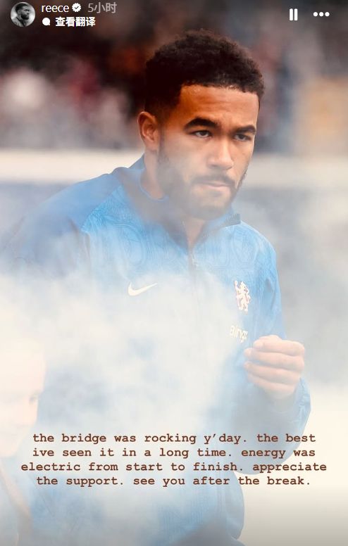 雷速体育10月6日讯 近日切尔西后卫里斯·詹姆斯更新了社媒。里斯·詹姆斯晒出自己身穿切尔西球衣照,并且配文:“蓝桥昨天的比赛助威声山呼海啸,我已经很长时间没有看到这么好的氛围了,全场(球迷)都保持了能量和激情,感谢你们的支持,国际比赛日后见。”上轮