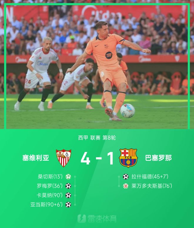 英超战役惊人相似,仿佛是同一剧本的翻版。本轮之前,巴萨本有机会凭借一场胜利登上西甲积分榜首位。然而,客场面对状态不俗的塞维利亚,红蓝军团从开场便陷入被动。上半场,前巴萨旧将亚历克西斯·桑切斯主罚点球命中,为东道主先拔头筹。随后,罗梅罗再入一球,将比分扩大为2-0。尽管拉什福德在上半场补时阶段以一记精彩的左脚凌空抽射为巴萨扳回一城,但球队仍带着1-2的劣势进入中场休息。下半场风云突变。第76分钟,巴萨迎来转机——巴尔德在禁区内被放倒,裁判果断判罚点球。然而,队长莱万多夫斯基主罚的点球却离谱偏出左侧立柱,错失了将比分扳平的黄金机会。这一失误成为比赛的转折点。