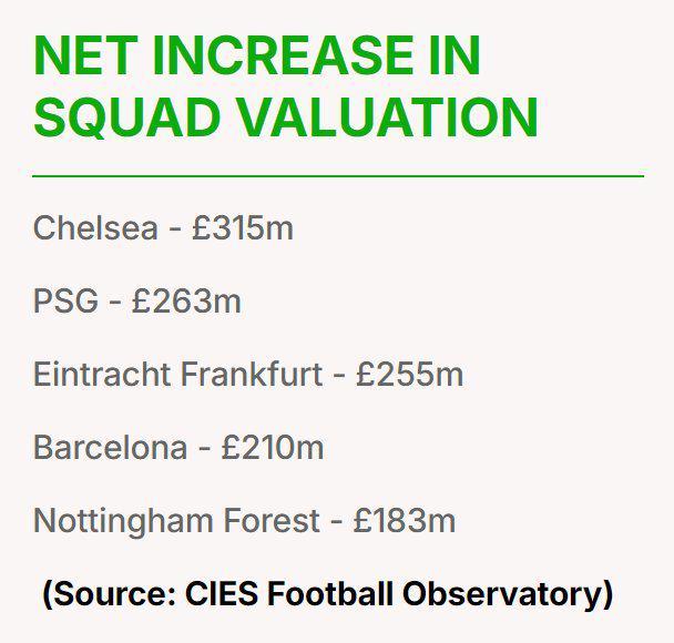 阵容增值最多,切尔西才是大智慧?英超 10-14 11:00切尔西这几年狂买年轻人的转会策略起初遭到广泛嘲笑,但近期风评明显转好。按照“足球天文台”估算,世界范围内,切尔西是过去一年中,阵容升值幅度最大的俱乐部,增幅达3.15亿英镑。排在蓝军身后的是巴黎(2.63亿)、法兰克福(2.55亿)、巴萨(2.1亿)、诺丁汉森林(1.83亿)。不仅如此,该机构的统计还将切尔西列为阵容身价之最,达到15.6亿镑,皇马(14.6亿)、曼城(12.8亿)等豪门都要靠后站。蓝军获得如此高看,显然与该队今夏拿到世俱杯冠军有着直接关系。