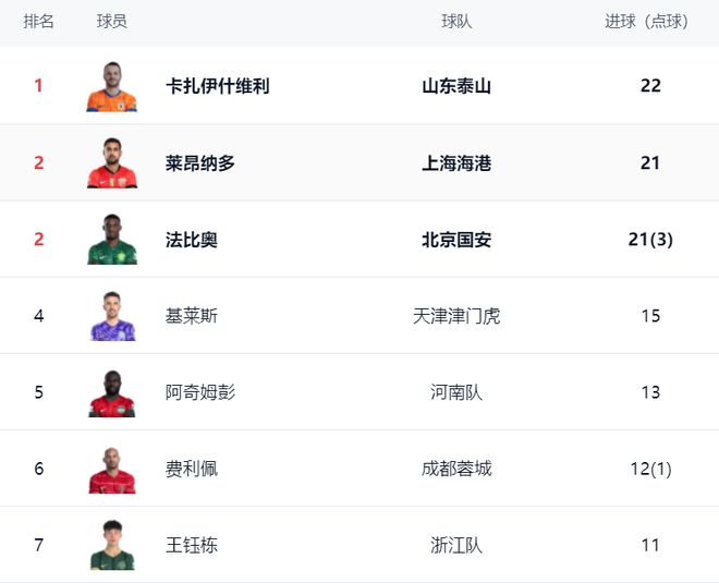 中超第27轮火热进行,强队纷纷获胜。上海海港和青岛海牛展开进球大战,结果上海海港笑到了最后,以4-3击败了青岛海牛,保住了榜首位置。这场比赛巴西外援莱昂纳多表现出色,他独造3球,包括2进球1助攻,是球队获胜的最大功臣。莱昂纳多连续4场联赛打进了8球。凭借时间的不断进球,让莱昂纳多在射手榜名次不断攀升,已经来到了第2的位置。莱昂纳多27场联赛打进21球,还有5个助攻。他是上海海港队中最强大腿。本赛季虽然上海海港缺少了武磊的贡献,但是,莱昂纳多站了出来,让上海海港踢了这么多轮依然能够站在榜首位置。莱昂纳多的进球数只比1人少。他就是山东泰山的卡扎伊什维利。卡扎伊什维利26场联赛打进了22球,送出5个助攻。卡扎伊什维利也只是比莱昂纳多1粒进球。以莱昂纳多近段时间火热的状态,或许下一轮就能够超越卡扎伊什维利。除了卡扎伊什维利,莱昂纳多争夺金靴还有一个强大的对手,他就是北京国安的前锋法比奥-阿布雷乌。法比奥-阿布雷乌也是打进了21球。不过,他有3粒进球是点球机会。而莱昂纳多没有点球进球,含金量更高一些。显然,本赛季的金靴之争非常激烈,前3的球星差距最多也就只有1球。最终谁能够笑到最后依然充满变数。本土球星中在射手榜排名最高的是18岁天才王钰栋。王钰栋打进了11粒进球,在本土球员中算是很出色了,只是没办法争夺金靴,被进球数前3的球星远远甩开。王钰栋已经连续6场联赛没有进球了,职业生涯陷入了瓶颈期。对手对王钰栋的风格逐渐熟悉,能够更针对性地限制王钰栋的发挥。王钰栋任重而道远,他需要继续提升自己,才能够接班武磊,成为俱乐部和国家队的核心。