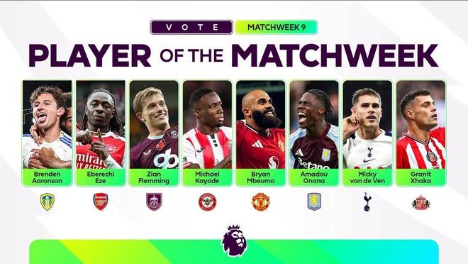 阿伦森(利兹联2-1西汉姆联)这位美国前锋在埃兰路的比赛中为利兹联贡献了一粒进球,帮助球队险胜西汉姆联,展现了不懈的拼搏精神,他是利兹联进攻的核心。他在比赛中有三次射门、创造了两次机会,并且3次过人全部成功,他在上半场的进球为全队的自信表现奠定了基调,同时他还在一次从本方半场深处的精彩突破后击中横梁。埃泽(阿森纳1-0水晶宫)埃泽在对阵旧主的比赛中表现出色,为阿森纳打入了他的首个英超进球,使枪手在积分榜上领先四分,他在下半场中段抓住关键时刻,禁区内精彩凌空抽射破门,为阿森纳在酋长球场全取三分。弗莱明(狼队2-3伯恩利)弗莱明在他仅仅第二次英超首发中表现出色,在开场30分钟内梅开二度,帮助伯恩利在莫利纽克斯球场上演了一场戏剧性的胜利。这位荷兰前锋的全面表现令人印象深刻——他有3次射正,6次在对方禁区内触球,并赢得了14次对抗,帮助伯恩利取得了一场关键的客场胜利。卡约德(布伦特福德3-2利物浦)卡约德再次展示了他在长传界外球上的威胁,在一场精彩的比赛中布伦特福德击败了利物浦他在比赛的开局阶段发挥了重要作用,他的界外球被克里斯托弗-艾耶尔头球摆渡,后者助攻丹戈-奥瓦塔拉破门。卡约德在防守端同样表现稳健,赢得了全部5次对抗,有7次夺回球权,并完成了3次解围,展现了出色的全面表现。姆伯莫(曼联4-2布莱顿)姆伯莫在老特拉福德继续着他的良好状态,打入两球,帮助曼联以4-2战胜布莱顿,他打入了球队的第三和第四粒进球,确保了他们的三连胜,将精准的终结能力与不懈的进攻活力结合在一起。他还在全队的射正次数(3次)和创造机会次数(2次)中排名第一,凸显了他在阿莫林指导下日益增长的影响力。阿马杜-奥纳纳(阿斯顿维拉1-0曼城)奥纳纳在维拉公园球场的比赛中展现了强大的中场表现,帮助维拉以微弱优势战胜曼城,这位比利时球员在中场掌控了比赛节奏,通过身体对抗和聪明的站位打破了曼城的进攻并扰乱了他们的节奏,他在控球时的冷静和无球时的积极跑动帮助维拉取得了联赛的四连胜。范德芬(埃弗顿0-3热刺)范德芬在希尔迪金森体育场表现出色,上半场打入两球,帮助热刺以3-0取胜,这位荷兰后卫在上半场通过角球两次头球破门,使球队掌握了比赛的主动权。他成为自2013年扬-费尔通亨以来首位在英超联赛中梅开二度的热刺后卫,也在比赛中也以精准传球(63次)、触球次数(86次)和拦截次数(3次)排名第一,展现了队长级别的领导力和防守素质。扎卡(切尔西1-2桑德兰)扎卡在中场展现了冷静和自信的表现,帮助桑德兰在斯坦福桥取得了一场令人印象深刻的胜利,继续他们本赛季的出色开局。这位瑞士国脚赢得了80%的地面对抗,完成了两次抢断并有一次拦截,帮助球队在关键时刻保持控球并掌控比赛节奏。【上咪咕独家看英超】