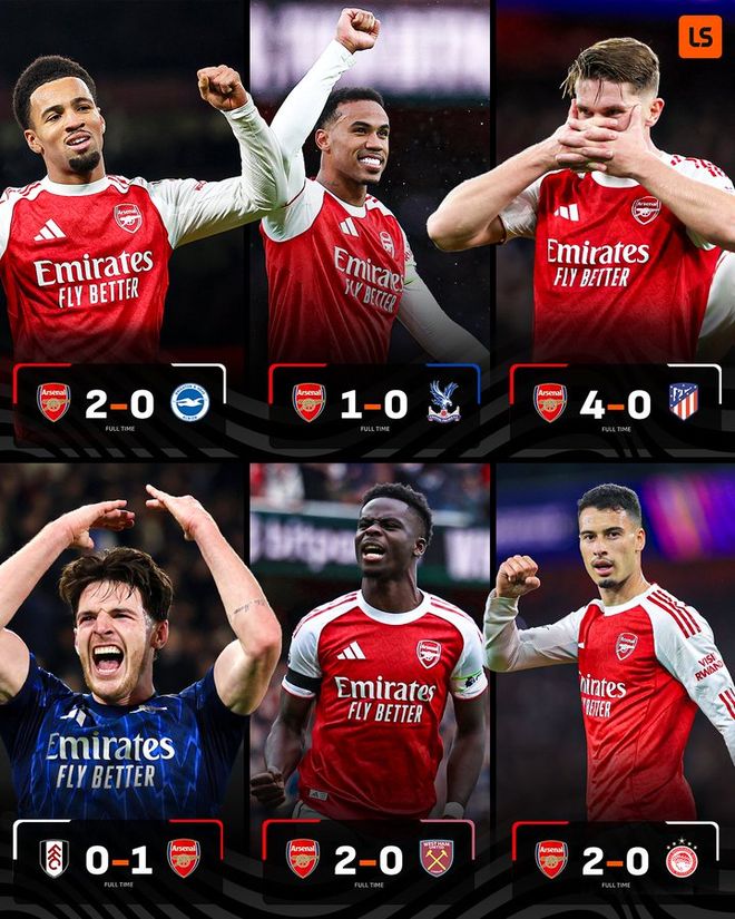 雷速体育10月30日讯 英联杯第4轮,阿森纳主场以2-0轻取布莱顿获得晋级资格。在整个10月的比赛里,阿森纳取得6战全胜且不丢一球,展现出极强的统治力。在整个10月的赛程里,阿森纳相继以2-0轻取奥林匹亚科斯(欧冠,主场)、2-0轻取西汉姆联(英超,主场)、1-0力克富勒姆(英超,客场)、4-0大胜马德里竞技(欧冠,主场)、1-0力克水晶宫(英超,主场)和2-0轻取布莱顿(英联杯,主场)。阿森纳在各条战线相当强势,在英超赛场上以7胜1平1负积22分领跑,领先身后的伯恩茅斯4分;欧冠前3轮全胜得到9分,排在第4位;英联杯也顺利获得晋级资格。