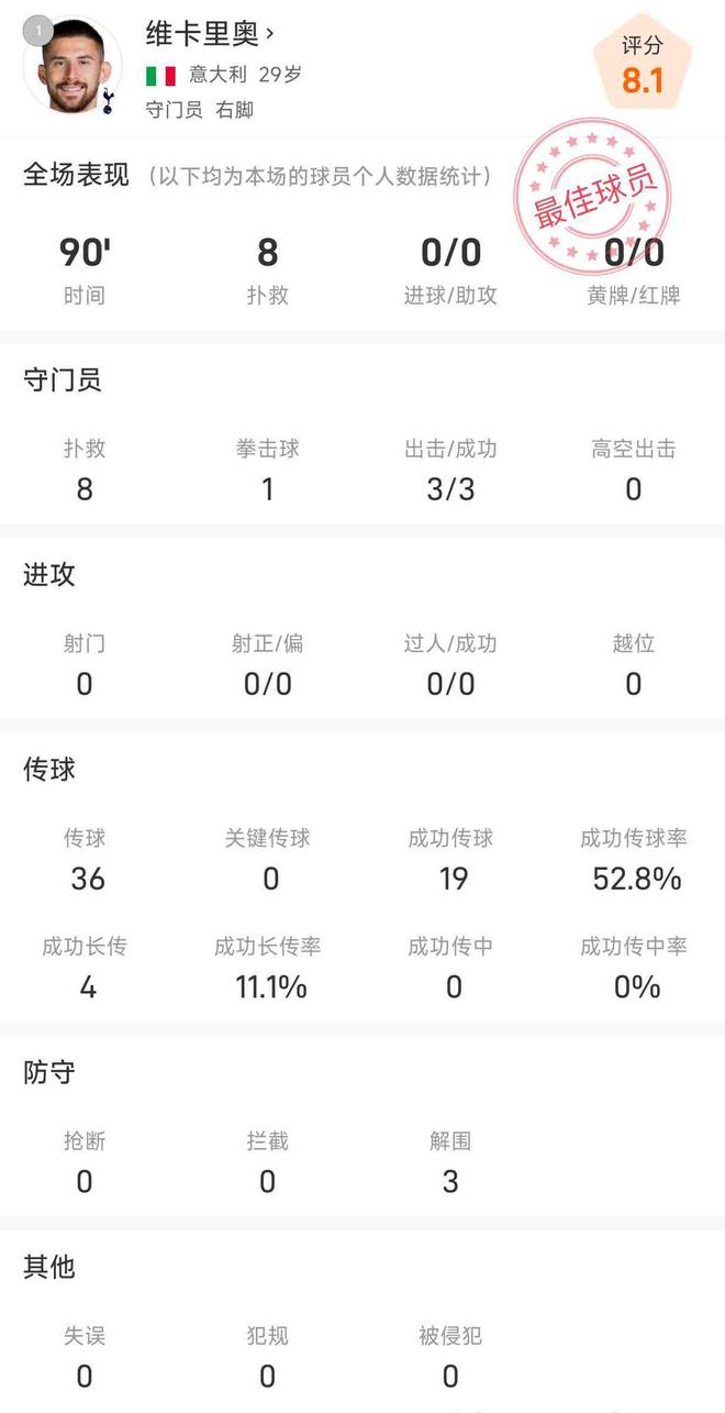 ,切尔西凭借佩德罗的进球1-0击败了热刺。本场比赛热刺门将维卡里奥出场90分钟,虽然未能帮助球队避免败局,但他做出了多达8次的扑救。数据显示,本场比赛维卡里奥除了8次扑救,还有1次拳击球,3次出击也全部成功。他36次传球,其中19次成功,包括4次长传成功。比赛中他还有3次解围。