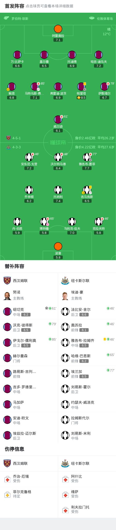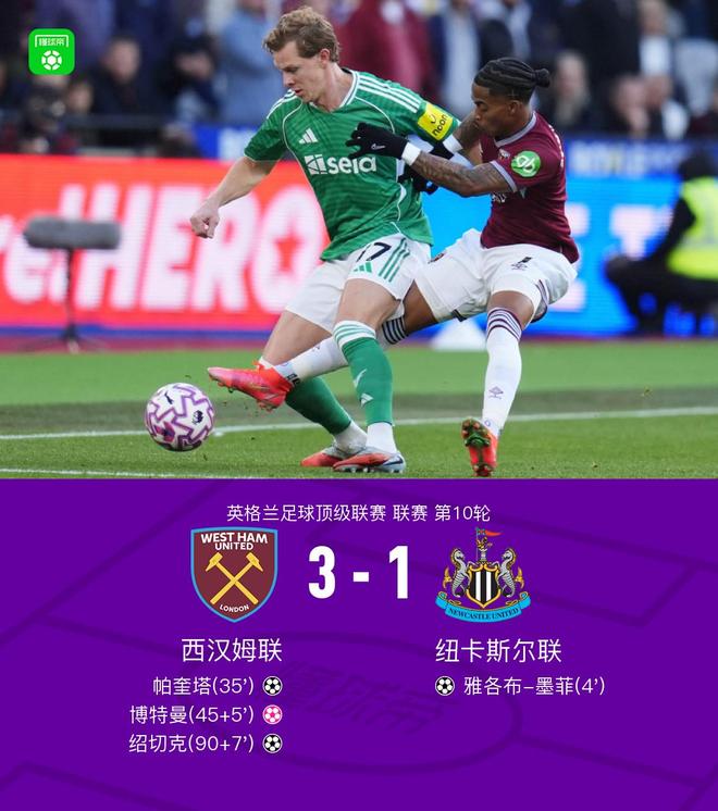 北京时间11月2日,英超联赛第10轮展开角逐,西汉姆联坐镇主场迎战纽卡斯尔联。吉马良斯助攻雅各布-墨菲闪击破门。帕奎塔一记世界波将比分扳平。上半场临近结束前,博特曼不慎自摆乌龙,西汉姆联借此反超比分。下半场,波茨进球越位在先,绍切克补射破门为西汉姆联锁定胜局。最终,西汉姆联3-1逆转战胜纽卡斯尔联。关键事件第5分钟,墨菲右路摆脱完成破门,纽卡1-0领先