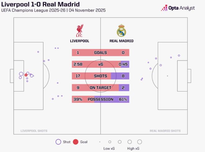 在安菲尔德球场进行的欧冠比赛中,利物浦以1-0击败皇家马德里,取得自去年9月以来首次连胜。麦卡利斯特在第61分钟攻入制胜球,主帅斯洛特的球队延续了上周末英超战胜阿斯顿维拉的积极势头。1-0的比分或许未能完全体现皇马在场上的被动。若非门将库尔图瓦多次神勇扑救,客队的失利可能更为惨淡。利物浦全场创造2.58的预期进球值,而皇马仅有0.45,红军堪称实至名归的胜利者。