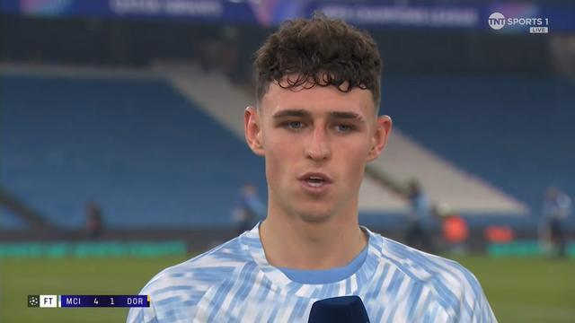 菲尔,恭喜你,这是一场多么精彩的比赛,我想先问你一个私人问题:你现在踢球的感觉,和你看起来的那样一样享受吗?是的,我非常喜欢。我只需要带着笑容踢球,我现在就是这么做的。显然,上个赛季非常艰难,不只是对我自己,对每个人来说都是。是的,这个赛季有了一种新的凝聚力,你在今天也能看出来这一点。多特蒙德给我们制造了一些麻烦,他们是一支很棒的球队。但是,是的,我们坚持了比赛计划,并用我们在锋线上的天赋击垮了他们,这就是我们想要努力去做的。是的,菲尔,你提到了上个赛季,你有什么收获?很明显,无论是个人还是俱乐部层面,上赛季都很艰难,但你从上赛季里学到了什么,并带进了这个赛季?当你经历困难时期的时候,你也会从中学习到很多东西。是的,我们队里有一些很棒的队长,我们讨论了如何才能重回正轨,而且我们也引进了一些很棒的球员,带来了真正的渴望和凝聚力。所以,是的,这关系到讨论我们如何才能重回正轨,努力成为我们曾经的那支球队,我认为这个赛季我们正在看到一些希望。朱尔斯刚才问了你的教练说你离恢复到最佳状态还有多远,而你的教练的脸上带着非常灿烂的笑容说“他已经做到了”,看起来你已经完全恢复到了最佳状态,达到了一个不同的水平,我们想给你看看你的进球,因为你今天晚上进了两个,我简直不敢相信,这也是你第一次在欧冠上演梅开二度,这是你的第一个进球,给我们讲讲你在那个小空当里的表现吧?