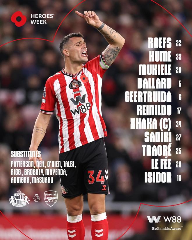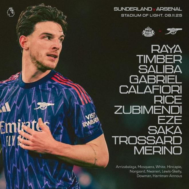 阿森纳首发:1-戴维-拉亚、12-廷贝尔、2-萨利巴、6-加布里埃尔、33-卡拉菲奥里、41-赖斯、36-苏比门迪、10-埃泽、7-萨卡、19-特罗萨德、23-梅里诺桑德兰首发:22-罗埃夫斯、32-休姆、20-穆杰莱、5-巴拉德、6-海特勒伊达、17-雷尼尔多、34-扎卡、27-萨迪基、25-伯特兰-特拉奥雷、28-勒费埃、18-伊西多尔