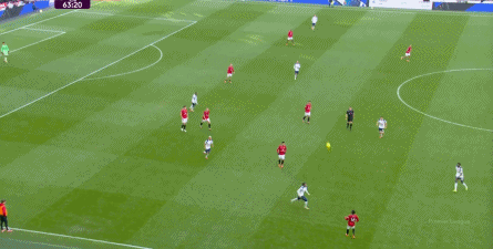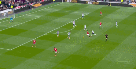 这就是年轻球员在大哥身边成长的过程,但对于曼联来说,你有反制能力,你才能打疼、打怕对手,对手向前投入进攻就会出现犹豫,这就是一个帮助防守端解压的方法。而且,在11轮比赛之后,曼联恰恰愈发呈现出重视转换的样子,因为在曼联11场进19球,射门数、射正数都位居前列,是联赛进球第四多的球队的情况下,曼联是本赛季英超第一支丢失球权次数超过1500次的球队。以1510次丢失球权,在这项数据上排名榜首。不仅如此,11轮比赛过后,曼联的传球数表现尚可,以4784次传球排名联赛第7,但传球成功率只有79%,排名联赛第12。这是因为曼联的长传次数很多,以644次排名联赛第2。所以当你将这些数据汇总起来一起关注,得出的结论就非常清晰了:在阿莫林的治下,曼联是一支清晰的转换型球队。用大家更容易理解的方法来说,那就是你可以说曼联没防守,但确实是一支很会反击的球队。这再次指向了阿莫林的战术思想,确实没有滕哈赫那般激进,因为后者绝对无法容忍球权不在自己的脚下,但对于阿莫林来说,这一点倒没什么。拉门斯的大脚一脚接一脚,球队已经相当习惯了。但是,在这种战术思想和现在的表现当中,曼联的问题也会因此加剧,那就是由于丢失球权次数太多,所以曼联在比赛中和对手之间形成的回合数太多,这一点是需要解决的,因为解决了回合数,球队,尤其是中后场的消耗就可以得到控制。防守质量,就有机会因此稍有提高。一个很清晰的解决方法就是提高自己的控球率,但由于曼联自己的技术能力有限,提高了控球率不仅会导致打转换的机会变少,还可能会出现抓不住打转换的机会的问题,更不用说可能会因此大幅暴露后场的空间。这显然不是阿莫林的战术思路,但在相对保守和中庸的流派当中,依然有办法,那就是控制住比赛的节奏:我想快的时候,就能快起来,而我不想快的时候,也可以让比赛慢下来。当然了,这一点也在很大程度上取决于曼联的中后场的防守意识,能否在7人,甚至6人防守当中,抵住对手最有威胁的第一波进攻,从而给中前场球员回来落位的时间。但还是那句话,曼联在这一点上是不能指望的,所以关键在于其他环节。虽然曼联在进攻端的布置在理论上稍有问题,库尼亚和阿玛德-迪亚洛在各自位置上的表现不足很清晰,导致上半场的反制能力没能拔到理论上的最高值,但曼联还是先进一球,而且线路上恰好是右路的阿玛德-迪亚洛传给左路的姆贝乌莫: