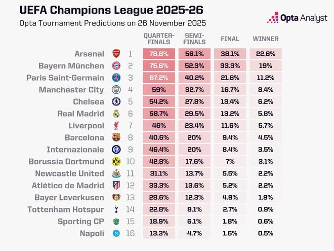 Opta超级计算机预测欧冠夺冠概率1 阿森纳 22.6%2 拜仁慕尼黑 19%3 巴黎圣日耳曼 11.2%4 曼城 8.4%5 切尔西 6.2%6 皇家马德里 5.8%7 利物浦 5.7%8 巴塞罗那 4.5%9 国际米兰 3.5%10 多特蒙德 3.1%11 纽卡斯尔联 2.2%12 马德里竞技 2.2%13 勒沃库森 1.9%14 托特纳姆热刺 0.9%15 葡萄牙体育 0.6%16 那不勒斯 0.5%【上咪咕独家看英超】
