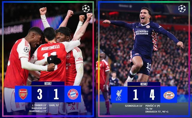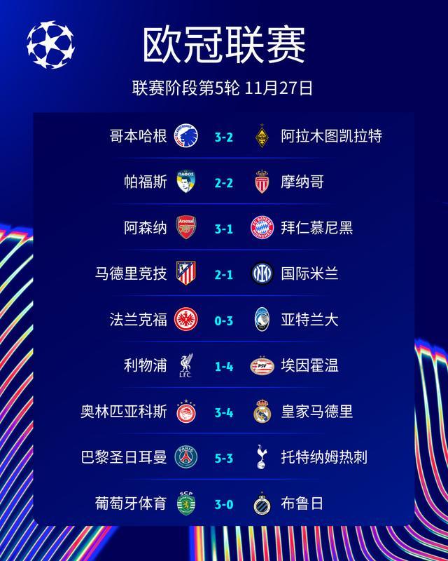 至此,第5轮第2天的9场较量战罢:哥本哈根3-2阿拉木图凯拉特、帕福斯2-2摩纳哥、阿森纳3-1拜仁慕尼黑、马德里竞技2-1国际米兰、法兰克福0-3亚特兰大、利物浦1-4PSV埃因霍温、奥林匹亚科斯3-4皇家马德里、巴黎圣日耳曼5-3托特纳姆热刺、葡萄牙体育3-0布鲁日!