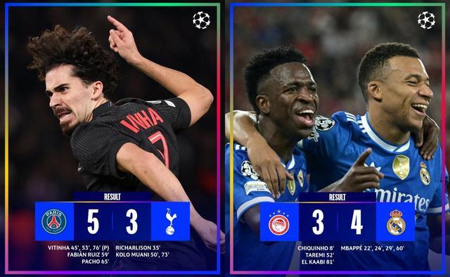 另一边,上赛季欧冠冠军巴黎迎战热刺。维蒂尼亚上演帽子戏法,法比安、帕乔和穆阿尼进球,里沙利松首开纪录和穆阿尼梅开二度,最终巴黎主场5-3取胜积12分排在第2,热刺积8分位列第16。皇马客场4-3险胜希腊豪门奥林匹亚科斯,积12分升至第5,姆巴佩上演大四喜当选MVP!