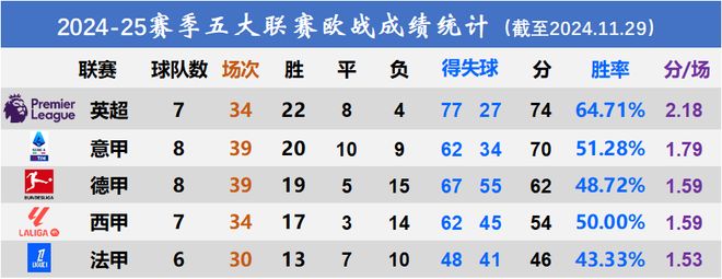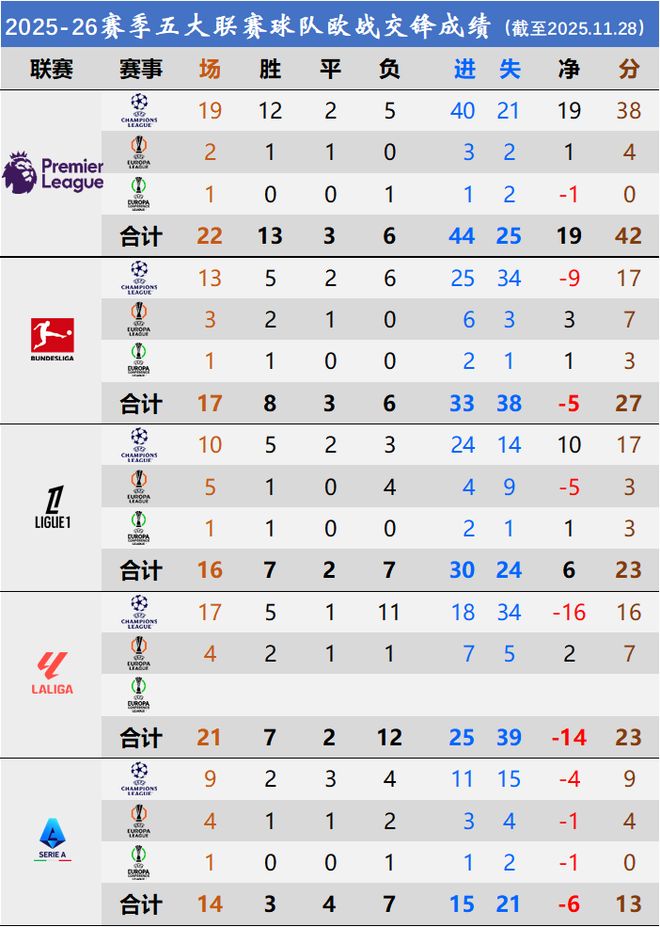 所以标题应该换成:德意西法仍菜鸡互啄,英超虽维持第一却大幅退步:分数去哪了?这是开玩笑。尽管有对手不同的因素,但五大联赛球队之间“内战”的成绩应该具有说服力。