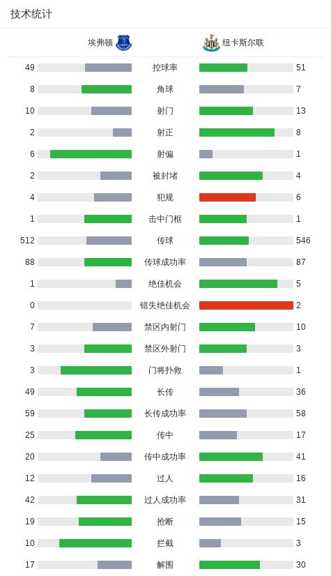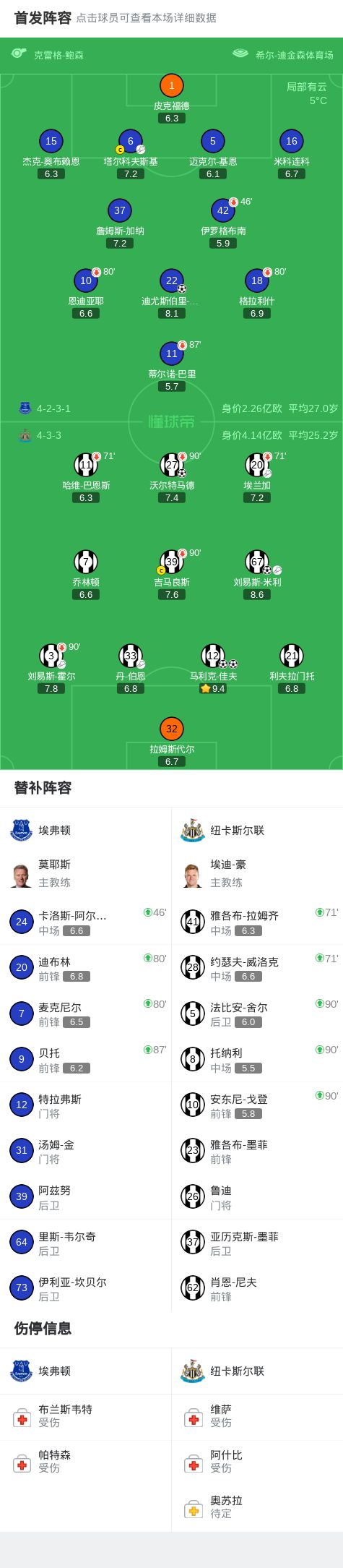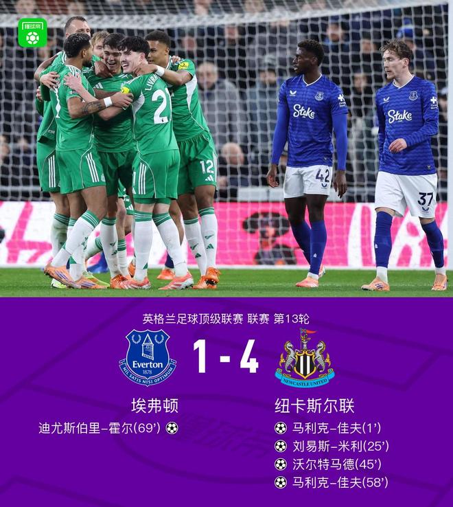 北京时间11月30日英格兰足球顶级联赛 联赛 第13轮,埃弗顿主场对阵纽卡斯尔联。埃弗顿迪尤斯伯里-霍尔破门。纽卡斯尔联马利克-佳夫梅开二度,刘易斯-米利破门,沃尔特马德破门。最终比分埃弗顿 1-4 纽卡斯尔联。关键事件第1分钟,开场闪击,马利克-佳夫抢点头球破门,纽卡斯尔联1-0