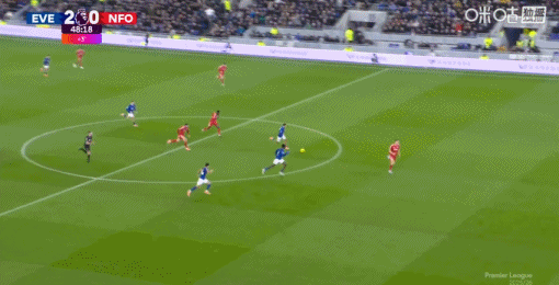 上咪咕独家看英超第45+3分钟,埃弗顿前场三打一,恩迪亚耶助攻巴里破门,埃弗顿2-0森林