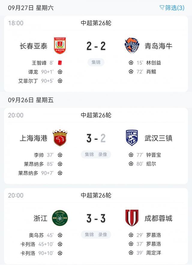 09月27日讯 本轮中超争冠和保级关键较量多次出现绝杀、绝平好戏。蓉城3-0领先情况下被浙江追成2-3,第100分钟浙江完成绝平海港第77分钟1-0领先被三镇2-1逆转,但第85分钟扳平,第97分钟完成绝杀亚泰开场8分钟少打一人+0-1落后,第91分钟仍0-2落后,但4分钟内连入两球完成绝平!