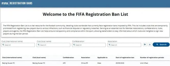 FIFA官方注册禁令披露系统近日公布新增北京国安一条禁令,禁令为无限期直至案件解决。在解决前北京国安将不能操作国际国内转会,以及注册新球员。