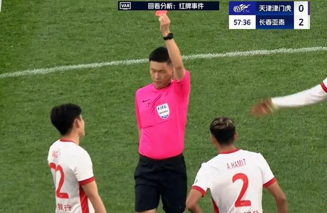 第38分钟,王秋明头球击中横梁,运气不佳。易地再战,第58分钟,王禹飞铲铲到了哈达斯脚踝,主裁判先是出示黄牌,VAR介入,改为红牌。长春亚泰少打一人!
