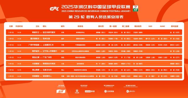 11月1日14:30,2025赛季中甲联赛第29轮也就是倒数第2轮8场比赛同时开球。赛前,中国足协发布了本轮裁判人员选派安排。其中,与冲超、保级有关的5场比赛,全部安排了视频裁判(VAR)。这在本赛季中甲赛场还是首次。备受关注的冲超大战中,重庆铜梁龙主场迎战苏州东吴,来自浙江的中超序列裁判员邢琦,担任主裁判,视频助理裁判是来自山东的戴弋戈。青岛红狮虽然提前降级,但其主场与广东广州豹的较量,事关冲超走势。主裁判是来自上海的中超序列裁判员徐强强,视频助理裁判是来自上海的国际级裁判员沈寅豪。与保级有关的3场比赛中,广西平果与上海嘉定汇龙的比赛,由来自江苏的裁判员崔跃强执法,视频助理裁判也来自江苏,是何晓春。定南赣联与深圳青年人的比赛,主裁判是来自天津的韩磊,视频助理裁判是来自煤矿的刘钊。佛山南狮与石家庄功夫一役,则由来自北京的李会刚担任主裁判,视频助理裁判是来自武汉的顾春含。本轮赛前,冲超区重庆铜梁龙领先广东广州豹2分;保级区广西平果积22分,距离安全区还差2分,深圳青年人、佛山南狮分别积24分、28分。从目前的积分榜格局来看,本轮过后,有可能产生另1支冲超球队或降级球队。