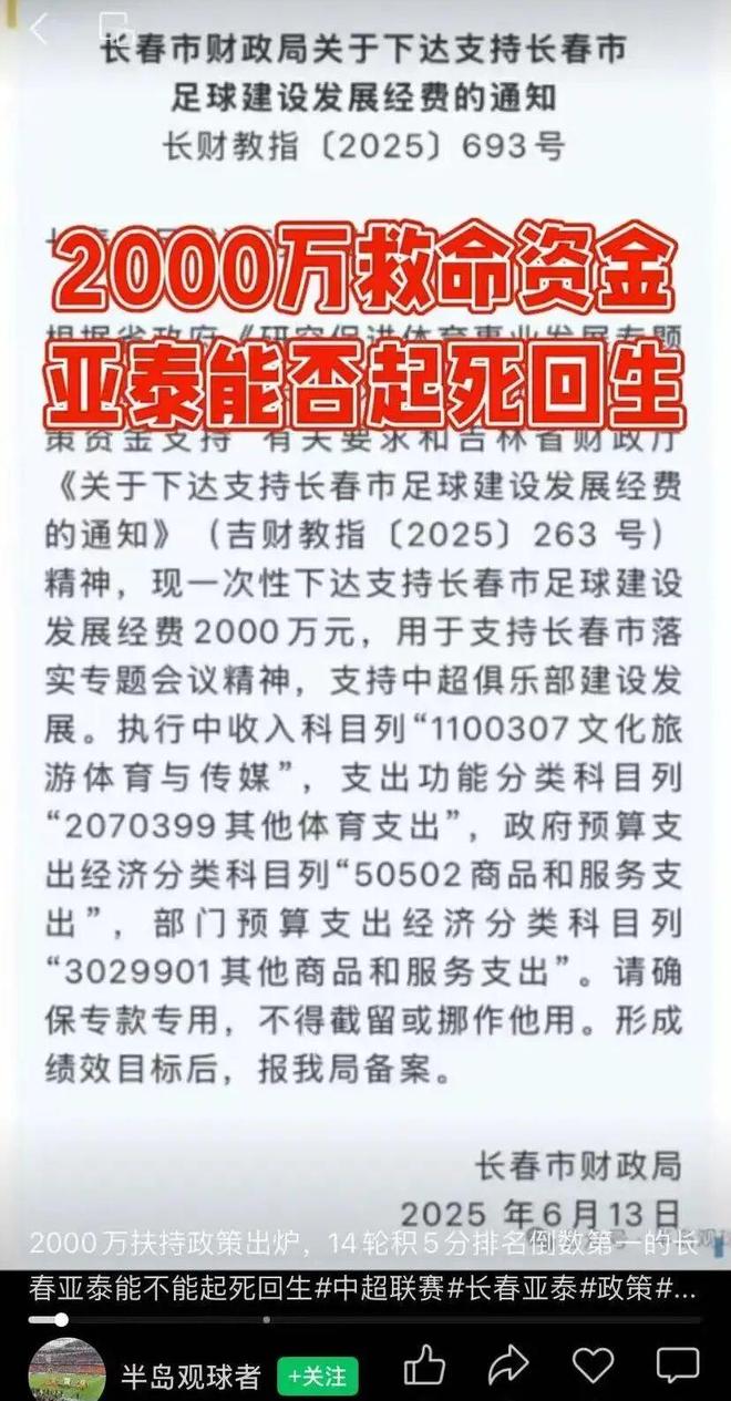 其实早于长春亚泰在十六支球队中排名垫底之时,吉林省政府主要领导调研中明确提出“助力长春亚泰足球俱乐部在中超联赛中保持合理位次”。长春市专门下达2000万元财政资金,用于支持长春市足球建设发展,助力长春亚泰起死回生。
