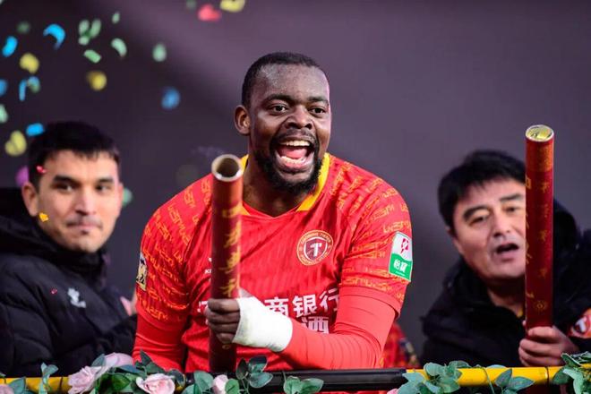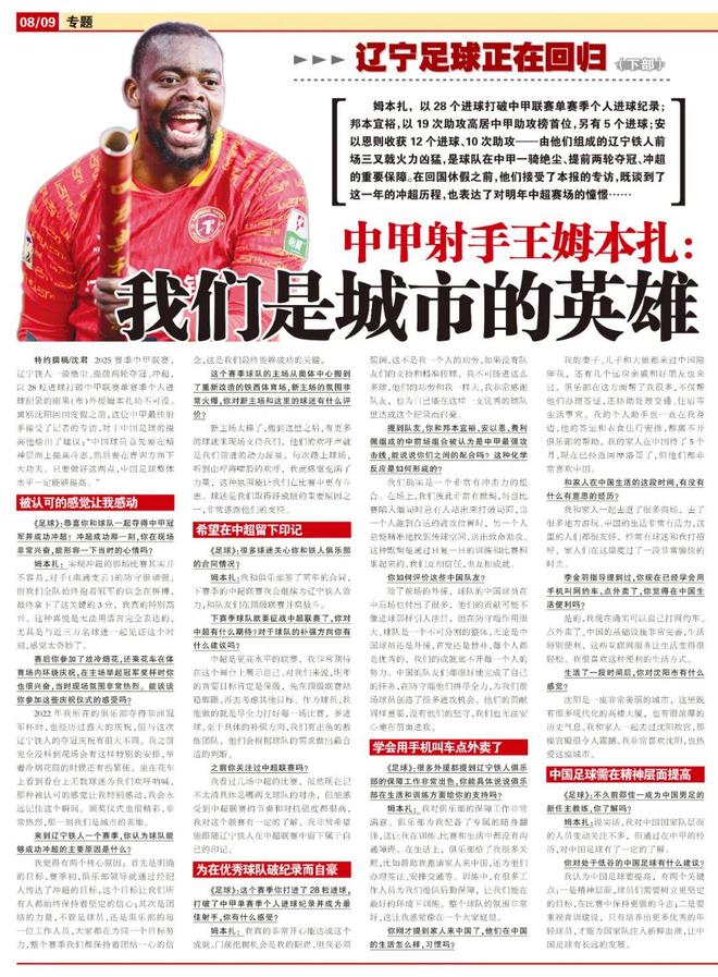 ◆《足球》:恭喜你和球队一起夺得中甲冠军并成功冲超!冲超成功那一刻,你在现场非常兴奋,能形容一下当时的心情吗?姆本扎:实现冲超的那场比赛其实并不容易,对手(南通支云)的防守很顽强,但我们全队始终抱着冠军的信念在拼搏,最终拿下了这关键的3分,我真的特别高兴。这种喜悦是无法用语言完全表达的,尤其是与近三万名球迷一起见证这个时刻,感觉太奇妙了。◆赛后你参加了放冷烟花,还乘花车在体育场内环绕庆祝,在主场举起冠军奖杯时你也很兴奋,当时现场氛围非常热烈。能谈谈你参加这些庆祝仪式的感受吗?2022年我所在的俱乐部夺得非洲冠军杯时,也经历过盛大的庆祝,但与这次辽宁铁人的夺冠庆祝有很大不同。我之前完全没料到现场会有这样特别的安排,举着冷烟花筒的时候还有些紧张。坐在花车上看到看台上无数球迷为我们欢呼呐喊,那种被认可的感觉让我特别感动,我会永远记住这个瞬间。颁奖仪式也很精彩,非常热烈,那一刻我们是城市的英雄。