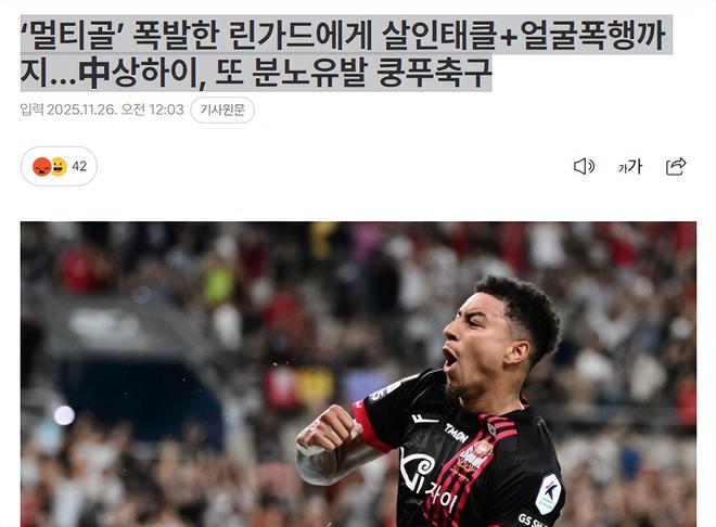 亚冠精英赛第五轮上海海港主场迎战首尔FC,这支被中超亚军主场以2比0拿下的K联赛劲旅,结果却反过来3比1战胜中超卫冕冠军。更尴尬的是,上港5轮仅拿1分,申花4轮4分,成都蓉城5轮5分,此情此景让人搞不清楚到底谁才是中超第一名,谁才是中超第二,谁才是中超第三。赛后,外媒对张琳芃的爆铲进行狠批,并嘲讽了中超冠军。韩媒对张琳芃给林加德的凶铲进行了狠批,标题大意是林加德险遭凶狠飞铲,连中国球迷看了都直摇头。文章配图有两张图片,一张是张琳芃手推林皇面部(上图)标,另一张是飞铲时的镜头(下图)。谈到张琳芃的粗暴飞铲,该文还举例2012年的亚冠联赛中他对当时全北现代后卫赵城焕恶意飞铲,导致后者重伤。文章继续表示,在中超他以联赛夺冠次数最多(11次)而闻名,但同时也因屡教不改的非绅士化比赛作风而扬名。文章最后一段写道,刚实现中超三连冠的上海海港(目前亚冠仅积1分)在亚冠精英赛中却遭遇三连败,跌至12支参赛球队的垫底位置,赛后,球队竟在主场球迷面前举行了中超夺冠的庆祝仪式,引发球迷强烈不满,纷纷指责球员“输成这样还笑得出来?脸呢!”另一韩媒发文标题大意是:林加德梅开二度却遭凶铲+面部暴力,上海再演惹怒功夫足球(下图)。文章批评张琳芃的危险凶铲有可能导致林加德受伤。谈到两人的冲突,文章表示被铲倒后,愤怒的林加德随即起身与其发生冲突,而张琳芃更是变本加厉,用拳头推搡林加德的脸部。作者认为张琳芃这是一次明显的暴力行为,若被直接红牌罚下也无话可说。当时裁判是各打五十大板,各领黄牌一张。另外关注亚洲足球的football-tribe网站也对这场比赛进行了报道(下图),标题大意是:林加德大放异彩,中超冠军颜面尽失。这篇文章高度表扬了一传两射的林加德帮助首尔FC以3比1击败中超联赛冠军,让球队在东区前五场比赛中取得八分。紧接着,文章写道:上海海港则积1分排名东亚区的小组垫底。中超三连冠的四冠王排名倒数第一,你说尴尬不尴尬?正好对了文章标题。