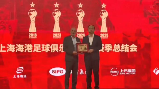 老帅和众弟子背后是主台的屏幕,上方赫然印着10个大字,写着:海港三连冠,四星耀申城。众所周知,本赛季夺取中超冠军后,海港完成连续3年夺冠的”伟业“,让俱乐部队史的中超冠军数量达到4个。如此荣誉的时刻,让上港人倍感自豪。